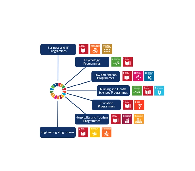 Law and Shariah Programmes: Connect to SDG 10 (Reduced Inequalities) and SDG 16 (Peace, Justice & Strong Institutions) through modules focusing on human rights, legal aid access, justice reform, equity in legal systems, and Shariah responses to poverty and marginalization.